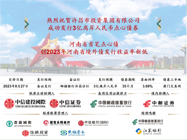 2023年9月27日,許昌市投資集團(tuán)有限公司(以下簡稱“許昌投資集團(tuán)”)成功在澳門金交所定價發(fā)行2023年度第一期高級無抵押離岸人民幣債券,本次發(fā)行是河南省首筆點心債券,規(guī)模3億元人民幣,期限35個月,票面利率3.69%,也是河南省國有企業(yè)打通境外人民幣融資渠道的創(chuàng)新嘗試,受到了投資者的高度認(rèn)可,全場認(rèn)購訂單超2倍,發(fā)行利率創(chuàng)近期點心債券新低。