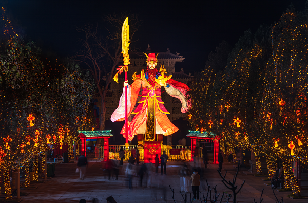 灞陵橋景區(qū)特邀自貢非遺團(tuán)隊(duì)純手工扎制十余組原創(chuàng)巨型燈組:戰(zhàn)馬列陣大門兩側(cè),巨幅曹操、關(guān)羽燈組巍然矗立,三國(guó)版十二生肖妙趣橫生——實(shí)現(xiàn)了“白天看細(xì)節(jié),入夜看意境”的雙重觀感。春秋樓的“春秋憶夢(mèng)光影秀”以現(xiàn)代科技演繹歷史傳奇。許都大劇院內(nèi),動(dòng)漫展的次元場(chǎng)景與脫口秀的潮流舞臺(tái),展現(xiàn)出傳統(tǒng)與現(xiàn)代的完美交融。