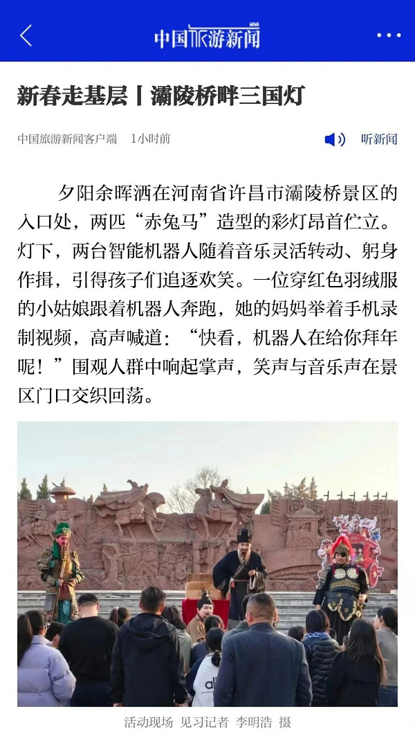 游客如潮,熱度攀升:從臘月二十七到正月二十,灞陵橋景區(qū)首屆三國(guó)主題燈會(huì)以23天超長(zhǎng)待機(jī),打造許昌近年來規(guī)模最大、時(shí)間最長(zhǎng)的春節(jié)文旅盛宴;顒(dòng)期間,兩大景區(qū)累計(jì)接待游客量突破預(yù)期,再創(chuàng)同期新高,成為市民游客新春出游的首選目的地。