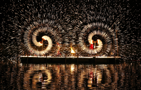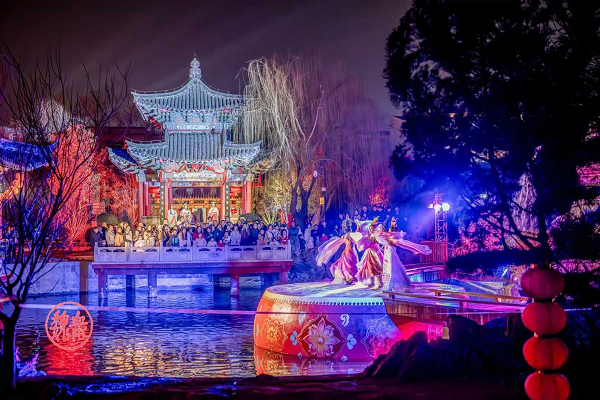 在灞陵橋景區(qū),首屆三國(guó)主題大型燈會(huì)構(gòu)建起“三國(guó)光影敘事長(zhǎng)廊”。30位三國(guó)人物NPC全天候散落景區(qū),開園迎賓、三國(guó)大巡游、主題舞蹈、豫劇相聲輪番上演。“打鐵花”非遺表演與“水上飛人”特技在春節(jié)假期及元宵期間聯(lián)袂獻(xiàn)技,水火交融的視覺奇觀讓游客驚嘆不已。