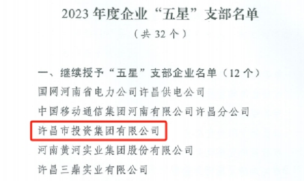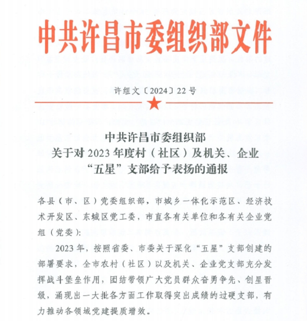 近日,中共許昌市委組織部印發(fā)了《關(guān)于對2023年度村(社區(qū))及機關(guān)、企業(yè)“五星”支部給予表揚的通報》,許昌市投資集團有限公司被繼續(xù)授予“五星”支部。